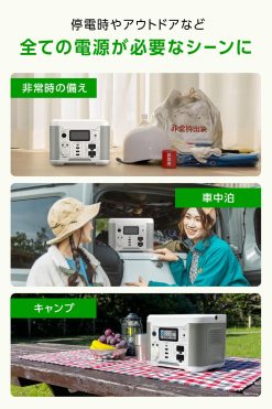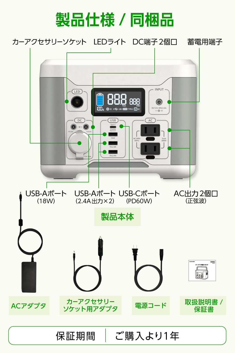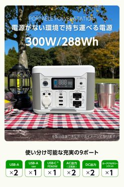 - AC出力(正弦波):AC100V x2個口(合計60Hz 300W Max)、DC出力:カーアクセサリーソケットx1個口、DC端子 (DC12V/5A)x2個口