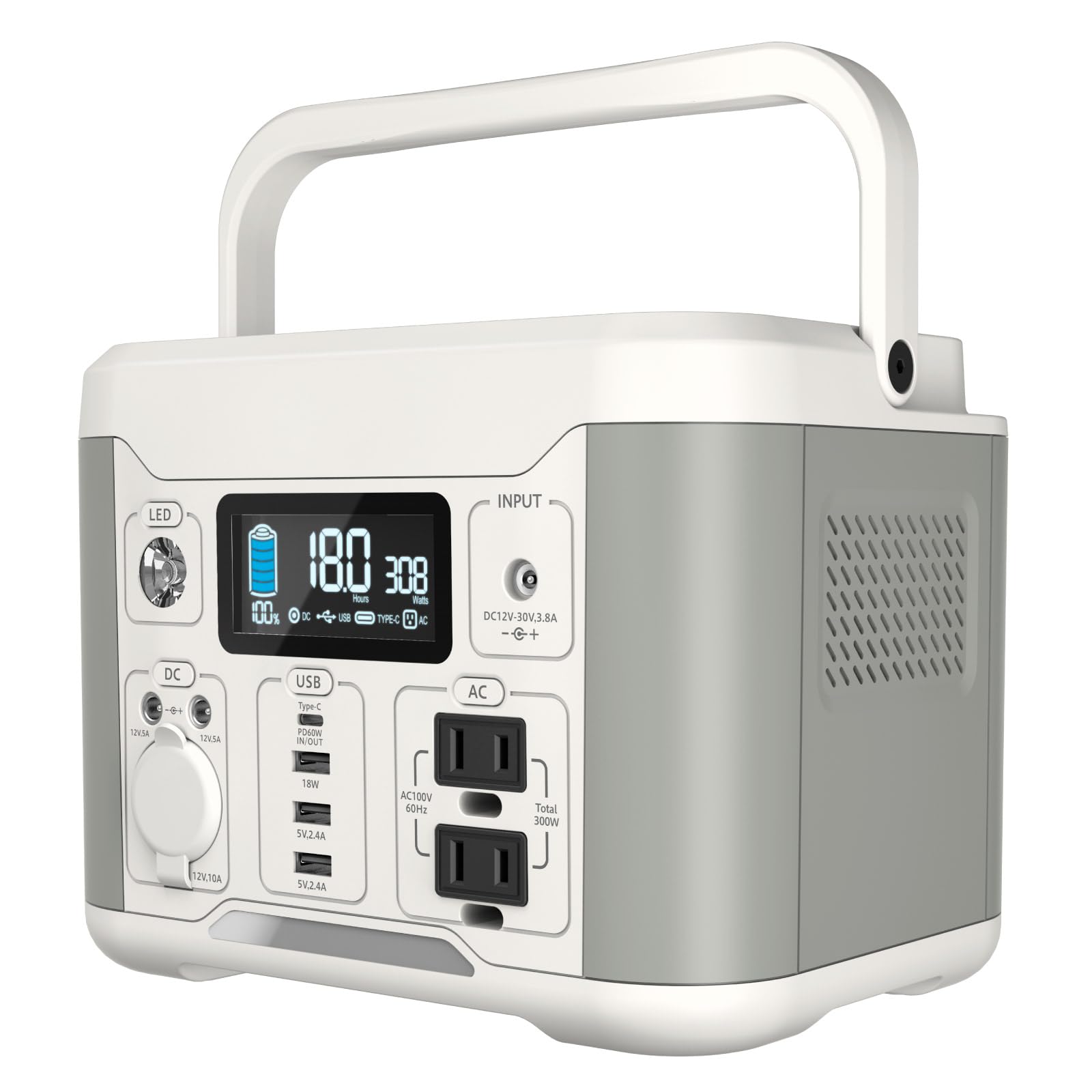 - 入力:DC端子 × 1個口 ((12V-30V/3.8A)適合プラグ外径4.0mm、内径1.7mm)、USB-C x 1( PD60W対応)