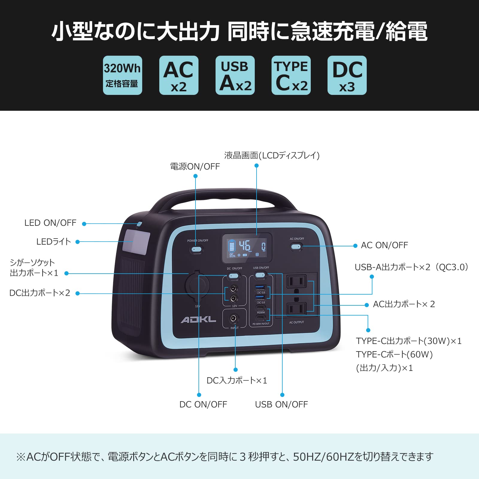- 【多様な出力ポート】このポータブル電源はACアダプターに対応することは言うまでもなく、USB-A、USB-C、DC充電にも対応できます。USBポートはPD30W、PD60WやQC3.0急速充電に対応できるポートを含め合計4口、純正弦波ACコンセント2口(50Hz/60Hz切替機能付き)、DC出力ポート2口(12V/10A)、シガーライターソケット1口出力が搭載しています。9個の出力ポートがあり、これ一台でスマートフォン、カメラ、パソコン、ゲーム機、電気毛布、ミニ冷蔵庫などさまざまな家庭用電気に同時に電力を供給することができます。それに、パススルー充電機能も備えられ、ポータブル電源を充電しながら、AC、DC、PD、USB出力を同時に行えますので、大変便利です。