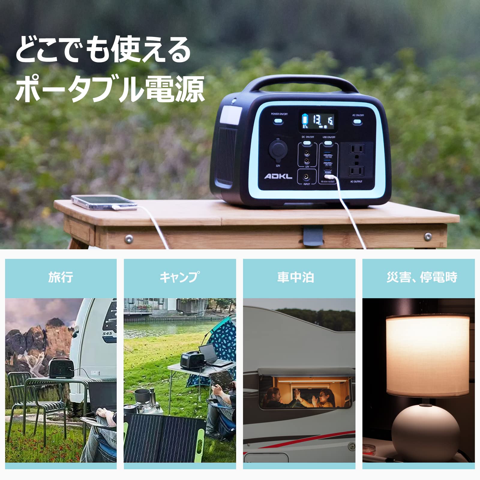 - 【4種類の充電方式に対応】このポータブル電源充電方法には、AC充電、ソーラーパネル充電、カー充電、Type-C(PD 60W)双方向充電の4つの方法があり、充電中にデバイスへ給電することも可能です。付属のACアダプターからの充電はもちろん、カーチャージャーからの充電にも対応。お出かけの際に社内で本体を充電しておけば、アウトドアやレジャーの電源として幅広くご使用いただけます。また、別売のソーラーパネルを使用すれば太陽光での充電も可能ですので、停電時にも安心してご使用いただけます。(PD充電ケーブルとソーラーパネルが付属しない)