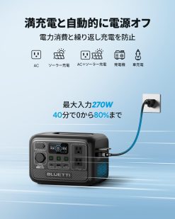 - 🔋【急速充電】AC2Aは3つのAC充電モードがあり、BLUETTIアプリで急速充電モードをオンにすると、最大270Wの入力でAC2Aを40分で0から80%まで、70分で100%まで充電できます。また、AC+ソーラー充電 (最大270W)、ソーラー充電 (最大200W)、車充電、発電機充電にも対応しています。