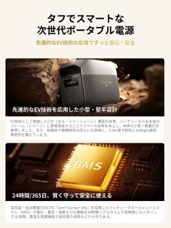 - 【先進的なEV技術の応用でずっと安心・安全】EV技術として発展したCTC(セル・トゥ・シャーシ)構造を採用。バッテリーセルを本体のフレーム(シャーシ)に直接実装することでスペース効率を向上し、本体の小型・軽量化を実現しました。また、耐震性や衝撃耐性の向上にも貢献し、0.2m落下耐性と100kgの面荷重耐性を備えています。
