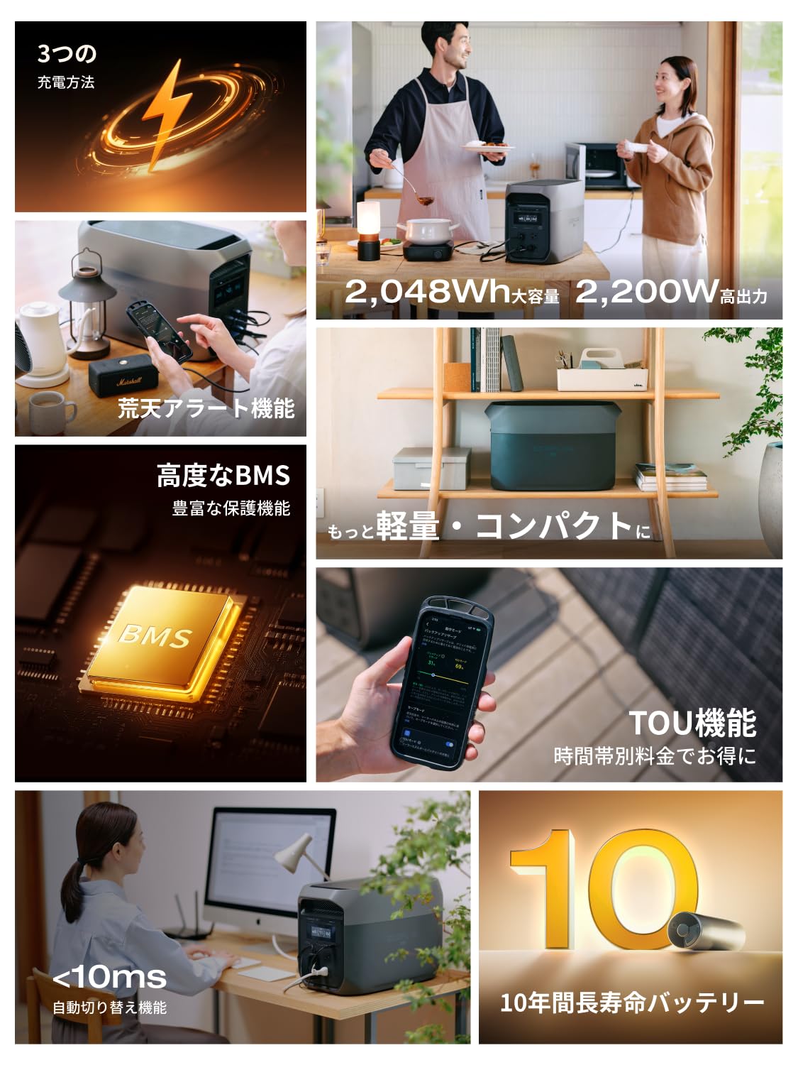 - 【安心の2,048Wh大容量 & 定格2,200W高出力】EVインバーターにも使われるSiC1パワー半導体を業界初採用。コンパクトながら定格2,200W高出力を実現し、電子レンジやドライヤーも安心稼働。2,048Whの大容量で非常時も安心、独自のX-Boostで最大2,700Wまで対応可能。
