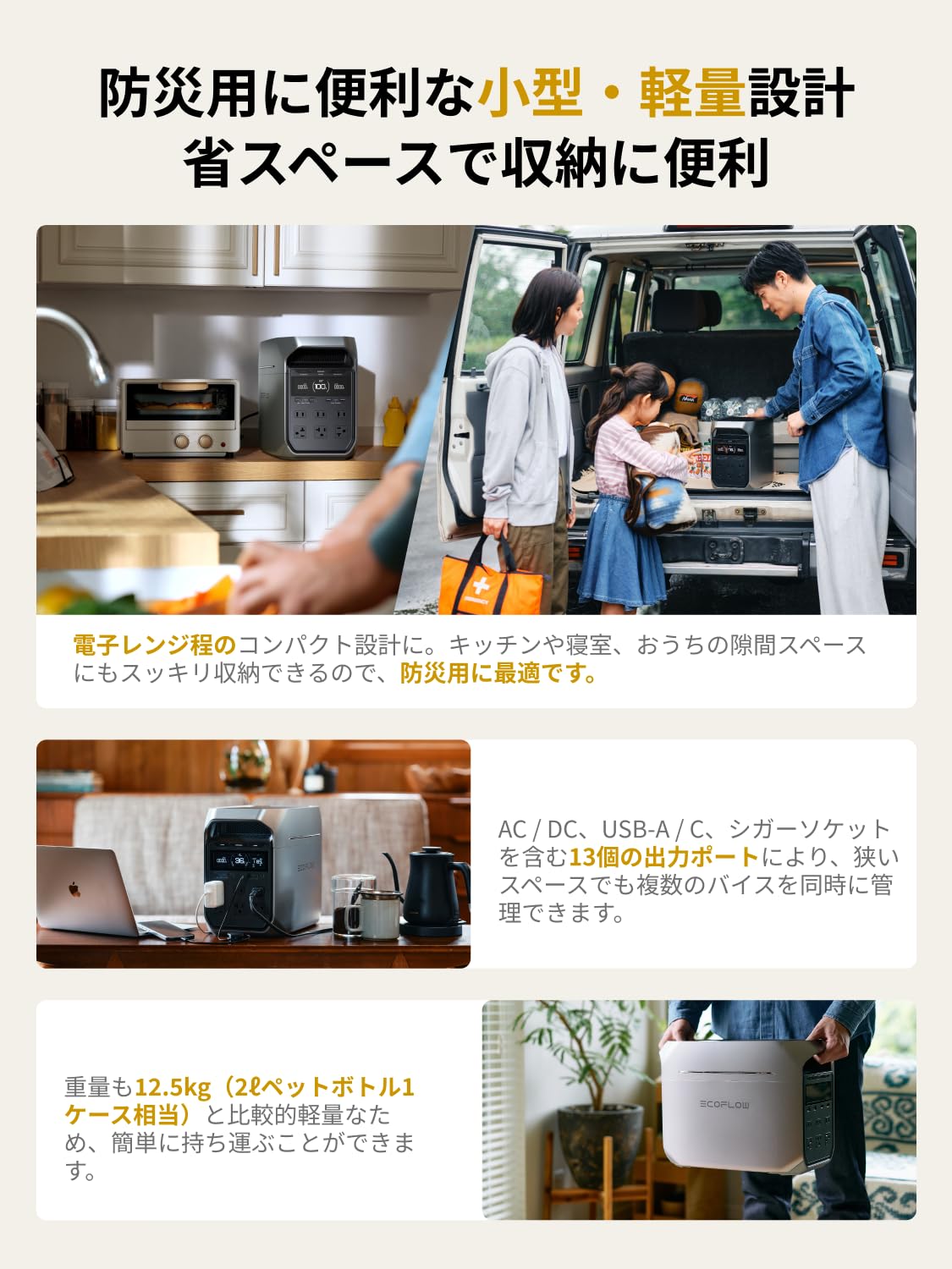 - 「防災用に便利な小型 & 軽量設計」キッチンや寝室、車のトランクや助手席に簡単に収まる省スペース設計です。防災用で自宅に置いても邪魔にならず、重量も2ℓペットボトル1ケース相当と持ち運びに便利、もしもの備えやアウトドアシーンに最適です。また、コンパクトデザインを誇るDELTA 3 Plusポータブル電源は13個の多用途出力ポートを有し、多くの電化製品をサポートします。多様な入力ポートも装備し、複数のデバイスに同時に対応します。