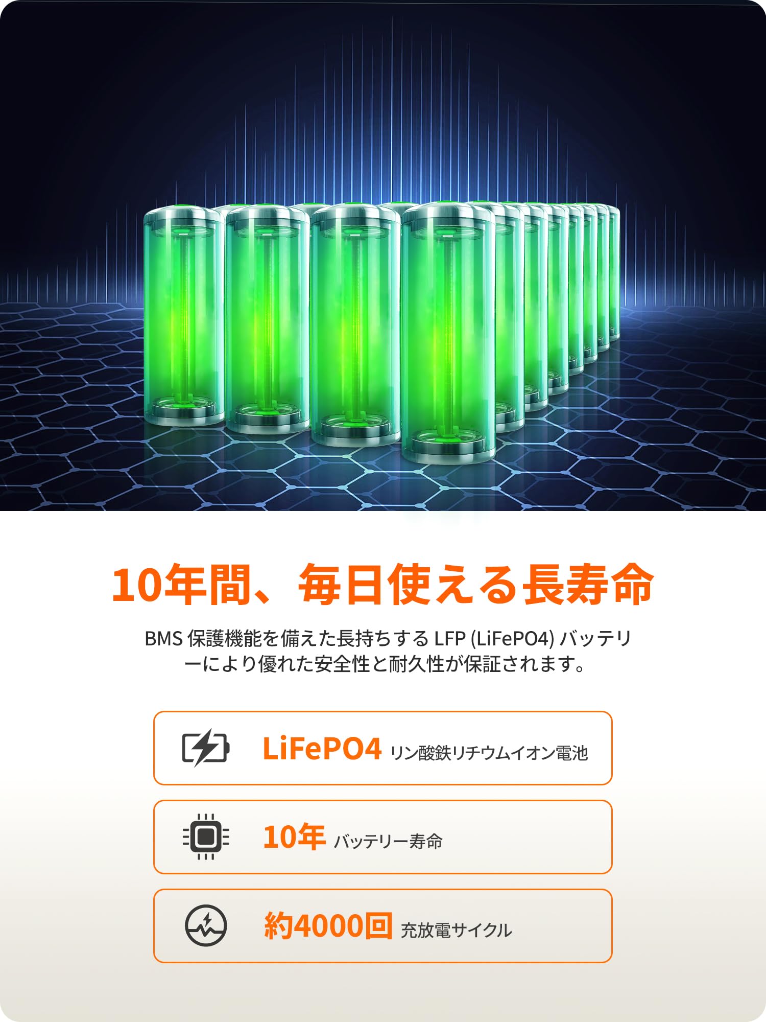 - 【10年使える長寿命】毎日充電しても10年間長持ちする高耐久リン酸鉄リチウムイオン電池、4,000回の充電サイクル後もバッテリー残量は70%を維持します。