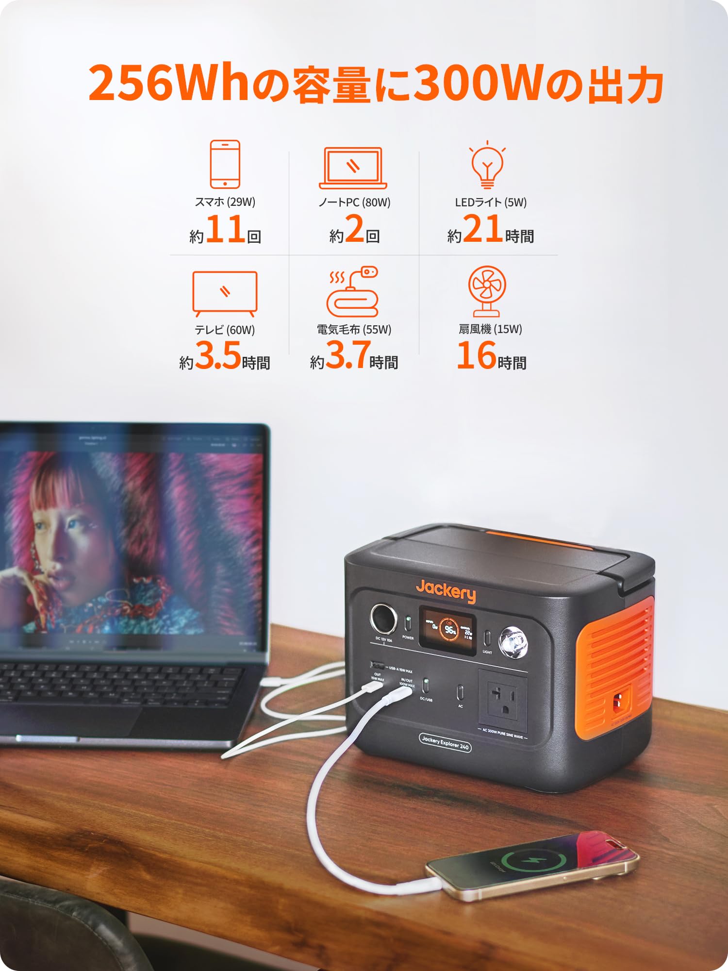 - 【256Whの容量に300Wの出力】従来モデルから大幅にパワーアップ。スマホやパソコンはもちろん、ライト、小型炊飯器、小型車載冷蔵庫、扇風機、電気毛布、プロジェクターなど、ひとり暮らし防災やソロキャンプをサポート。