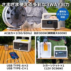 - AC出力:1個 100V/6A/50&60Hz 300W (瞬間最大600W) USB出力:Type-A Qualcomm Quick Charge2個、Type-C1個 DC出力:最大96W(DC12V シガーソケット)